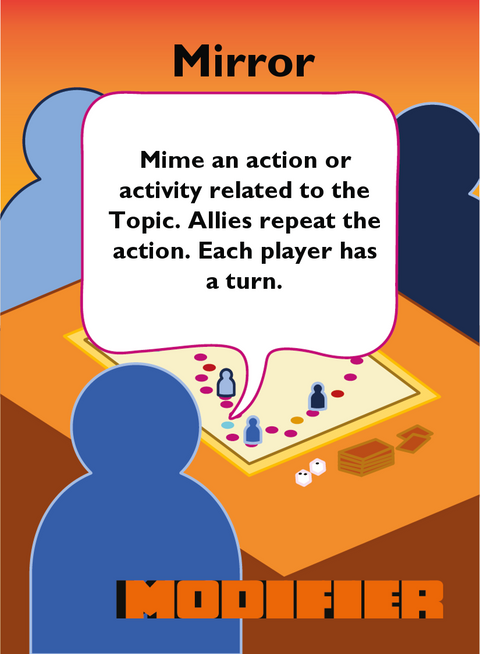 One Voice vs. Many Listeners. inspired by 20-questions, 1 Player has a secret Topic, others use Contribution cards to get clues. Quick, easy, delightful.